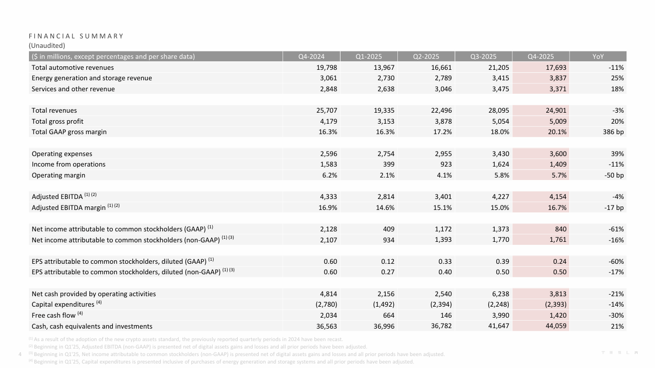 特斯拉公布的2025年财务数据显示,公司正经历业绩下滑与战略转型的双重挑战。全年总营收948.27亿美元,同比下降3%,这是自公司有业绩记录以来首次出现年度营收负增长;净利润37.94亿美元,同比降幅达46%。第四季度表现同样疲软,营收249.01亿美元,同比下降3%;净利润8.40亿美元,同比大幅减少61%,创下近年同期最低水平。