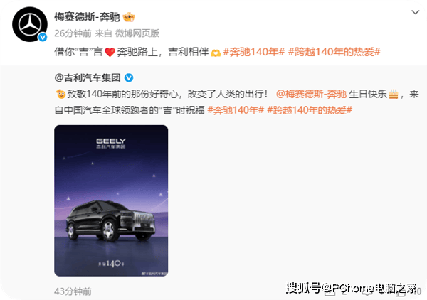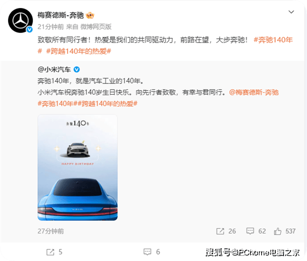 这场行业盛典引发广泛共鸣,小米汽车、理想汽车、蔚来、吉利、凯迪拉克、奥迪、鸿蒙智行等国内外车企通过官方账号集体发声。小米官方微博以“奔驰140年,就是汽车工业的140年”为题,强调“向先行者致敬,有幸与君同行”,创始人雷军更亲自转发该条内容。奔驰官方随即回应:“致敬所有同行者!热爱是我们的共同驱动力,前路在望,大步奔驰!”双方互动被网友称为“教科书级行业联动”。