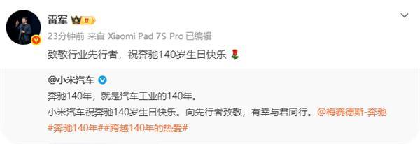 小米集团创始人雷军也通过个人渠道发声,向奔驰这一行业先行者表达了敬意,并祝愿奔驰140周岁生日快乐。雷军的这一举动,不仅彰显了小米集团对汽车行业的重视,也进一步拉近了小米汽车与消费者之间的距离。
