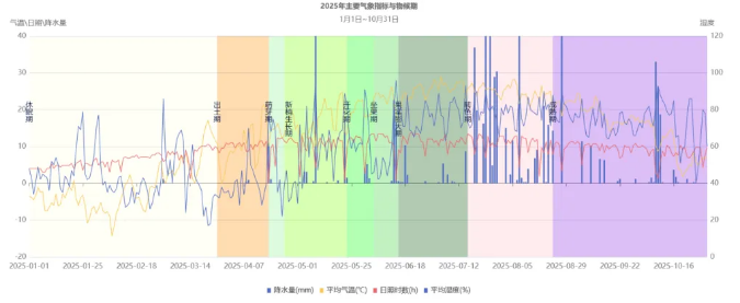 2025年怀来产区气候总体趋势呈现冷凉多雨的气候特点,全年最高温度为6月22日40.3℃、最低温度为2月7日-18℃,平均气温12.3℃,累计有效积温2119.1℃,日照时数3005.4h,降水量721.2 mm(创三十年记载以来历史峰值),平均湿度59.8%。天地无言,却以气候为语;人间有心,乃以耕耘为答。