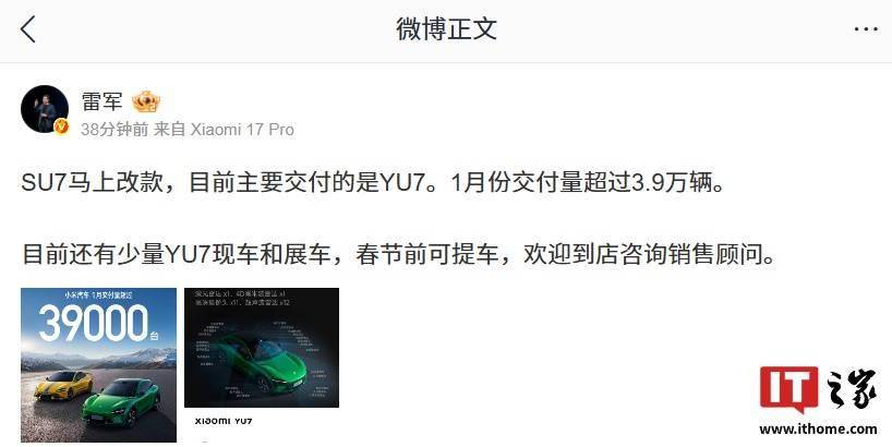 小米汽车近日公布了最新交付数据,2026年1月单月交付量突破3.9万辆,其中主力车型YU7成为交付核心。小米创始人、董事长兼CEO雷军在回应市场关注时透露,SU7车型即将迎来改款升级,当前生产资源已向YU7全面倾斜。