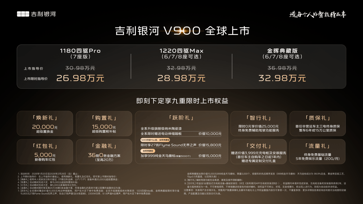 吉利汽车旗下高端品牌银河,近日正式推出全新旗舰MPV车型——银河V900,共带来3款配置版本,限时售价区间为26.98万至32.98万元。这款主打家庭市场的车型,以“三排同权”为核心理念,通过全车均等化的舒适配置,重新定义了多人出行的体验标准。