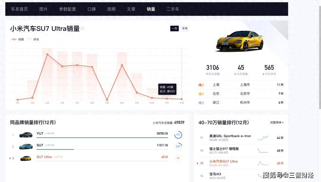 小米汽车近日成为市场关注焦点,其旗舰车型SU7 Ultra的销量走势引发行业热议。据第三方平台懂车帝披露,2025年12月该车型单月销量仅45辆,创下上市以来新低。这一数据与此前3月创下的3101辆月度峰值形成鲜明对比,暴露出高端电动车市场竞争的激烈程度。