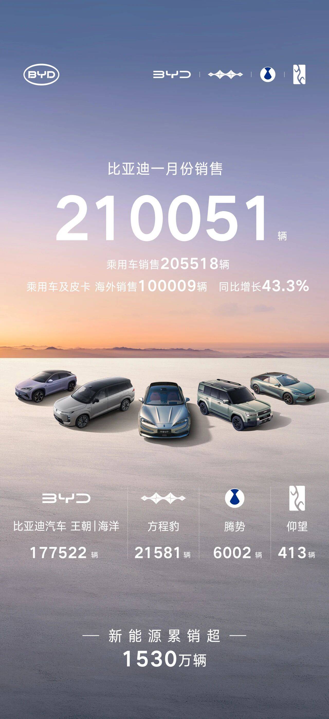 分品牌来看,比亚迪汽车王朝和海洋网系列依然是销量主力,1月单月销量达177,522辆。这两个品牌凭借丰富的产品线和精准的市场定位,成功覆盖了主流消费群体的需求。方程豹品牌以21,581辆的销量成绩紧随其后,其硬派越野车型在市场上持续保持热度,成为品牌增长的新亮点。腾势品牌则以6,002辆的销量展现了高端市场的稳定性,其MPV和SUV车型在细分市场中保持了稳健增长。仰望品牌虽然销量为413辆,但其在超豪华市场的独特定位和品牌影响力,使其成为比亚迪品牌向上战略的重要标杆。