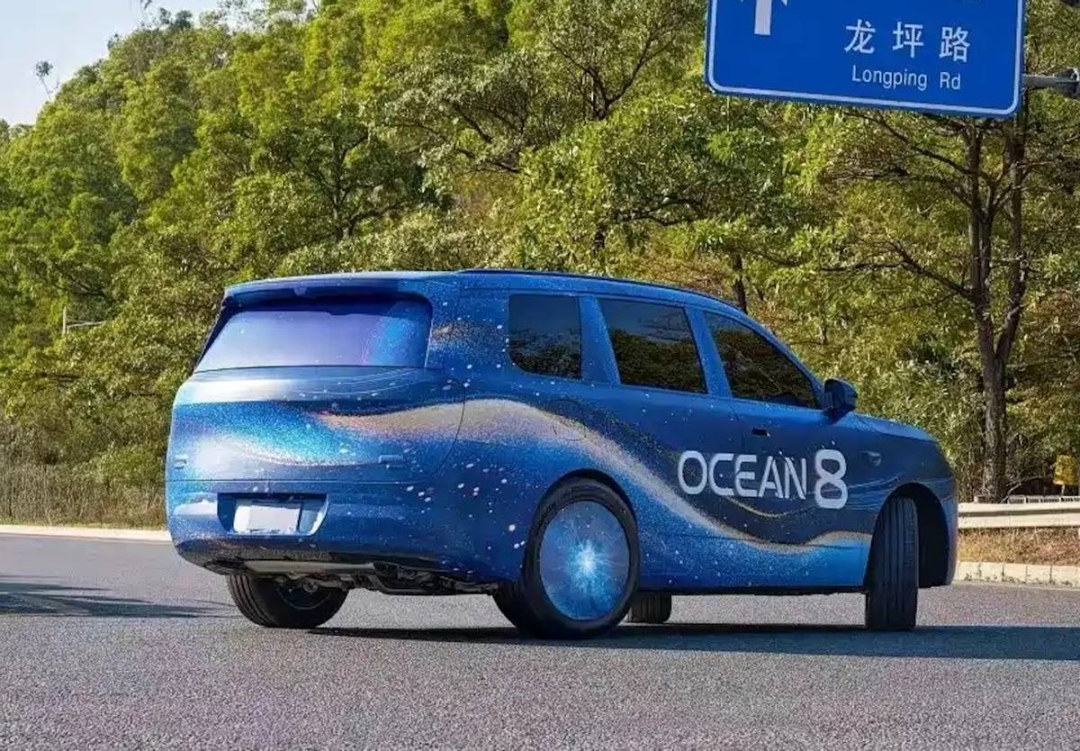 从设计语言来看,海狮08展现出硬朗大气的风格特征。其车身线条平直舒展,前脸采用分体式大灯组设计,车顶配备激光雷达装置。车尾部分设计简洁,预计采用贯穿式尾灯布局,顶部延伸出扰流板造型。测试谍照显示,该车在转弯时后轮呈现明显转向角度,印证了其搭载后轮转向技术的猜测。