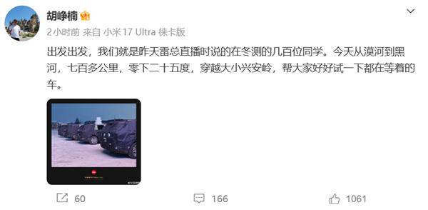 近日,小米汽车再次成为行业焦点,其全新大型增程SUV实车首次通过官方渠道亮相,引发市场广泛关注。据顺为资本投资合伙人、小米造车顾问胡峥楠在微博发布的动态显示,四款伪装测试车正在漠河至黑河的极寒环境下进行冬测,全程穿越大小兴安岭,覆盖700余公里低温路段,测试环境温度低至零下25摄氏度。
