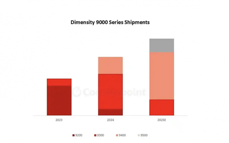 此前Counterpoint Research报告称,联发科天玑9000系列旗舰芯片在2024年全球出货量约为1800万颗,同比增长60%,并预测天玑9000系列在2025年的全球出货量有望进一步攀升至2400万颗。