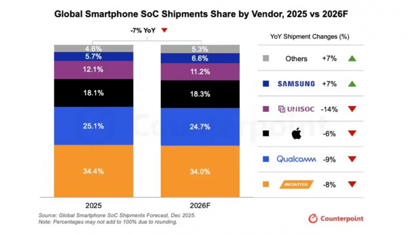 近日,市场调研机构Counterpoint Research发布2026年全球智能手机SoC芯片出货量预估报告。报告显示,在2025年的全球智能手机SoC市场,联发科以34.4%的出货量继续稳坐第一宝座,拉开第二名超9%的差距。