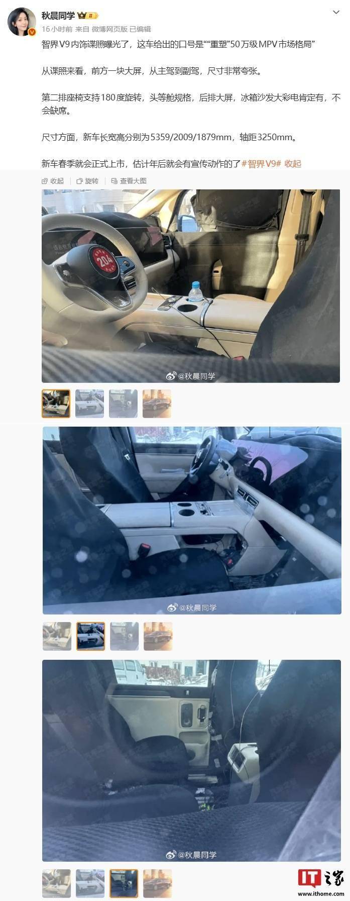近日,汽车圈关于鸿蒙智行智界 V9 的讨论热度持续攀升。先是博主 @秋晨同学 分享了该车旗舰 MPV 的内饰谍照,引发众多关注。从谍照画面来看,车内采用了最新的三联屏设计,一块大屏从主驾位置一直延伸至副驾,视觉效果十分震撼。同时,方向盘采用标准样式设计,更贴合 MPV 的驾驶习惯,为驾驶者带来更舒适的操控体验。