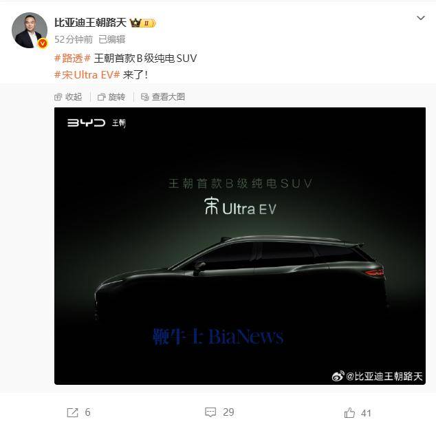 比亚迪王朝网即将推出一款全新B级纯电SUV——宋Ultra EV,这一消息由王朝网销售事业部总经理路天正式对外公布。作为王朝网首款B级纯电SUV,宋Ultra EV的亮相引发了市场的广泛关注。