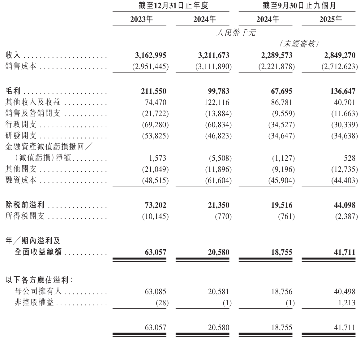 根据招股书披露的财务数据,铜博科技在2023年实现营业收入31.63亿元,毛利2.12亿元,期内利润6306万元;2024年营收微增至32.12亿元,但毛利下降至9978万元,期内利润缩减至2058万元。进入2025年后,公司经营状况有所改善,前9个月营收达28.49亿元,毛利1.37亿元,期内利润回升至4171万元。