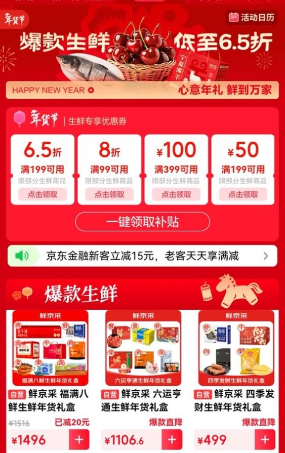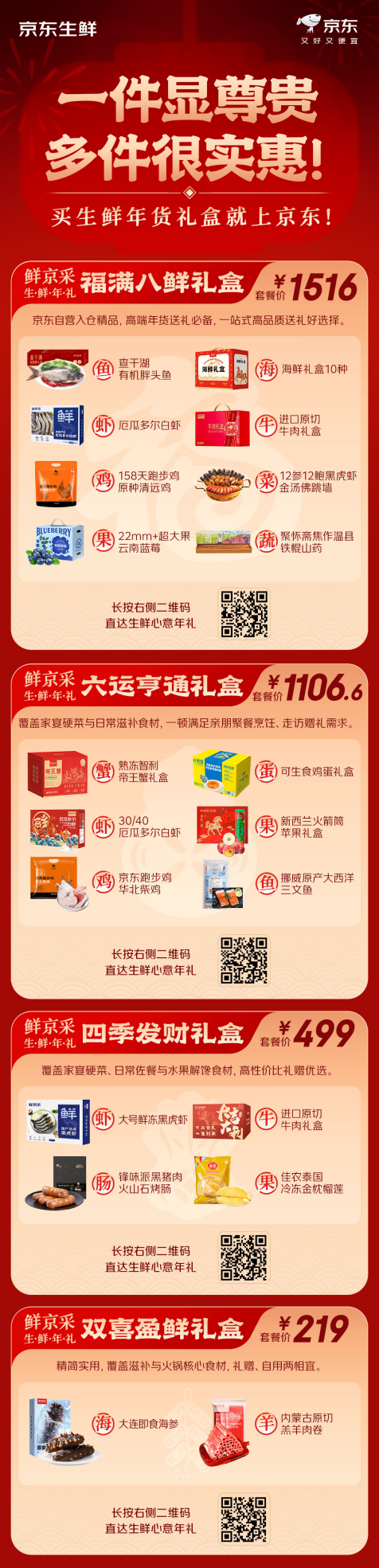 为了让消费者能更实惠地将各色年货礼盒带回家,京东生鲜还特别推出了聚合型年货礼盒套装,打造高性价比购买方案。其中,鲜京采福满八鲜礼盒精选查干湖有机胖头鱼、厄瓜多尔白虾、清远跑步鸡、云南蓝莓等8款优质礼盒,是高端赠礼的体面之选;六运亨通礼盒涵盖帝王蟹、跑步鸡、三文鱼等宴客硬菜与日常食材,轻松满足亲友聚餐与走亲访友的双重需求;四季发财礼盒精选黑虎虾、原切牛肉、金枕榴莲等兼具品质与实用性的美味;双喜盈门礼盒则聚焦即食海参与羔羊肉卷,精简实用,无论是赠礼还是自家享用都十分合适。