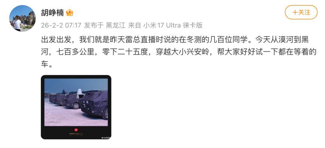近日,顺为资本投资合伙人胡峥楠在社交平台发布了一组小米汽车冬测实车伪装照,首次以官方视角确认了小米大型SUV项目的存在。从曝光画面可见,测试车队包含至少两款不同尺寸的车型,推测将形成覆盖五座与七座布局的产品矩阵。这一动态与去年10月雷军率队赴新疆开展路测的报道形成呼应,显示小米汽车第三款车型已进入研发冲刺阶段。
