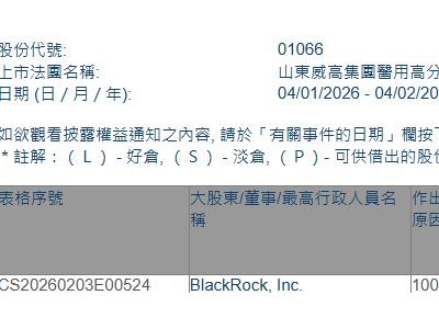 格隆汇2月4日丨根据联交所最新权益披露资料显示,2026年1月30日,金力永磁(06680.HK)遭JPMorgan Chase & Co.以每股均价22.1537港元减持好仓166.23万股,涉资约3682.6万港元。