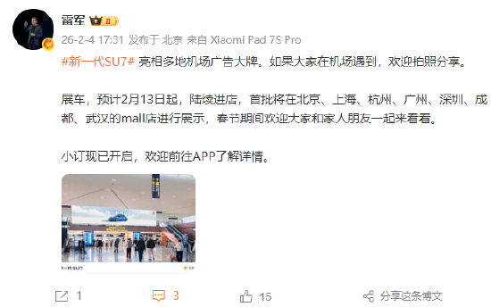 小米汽车又有新动作!雷军近日在社交平台透露,新一代SU7已正式登陆多地机场广告位,吸引往来旅客的目光。若在机场偶遇这款新车广告,欢迎拍照分享互动。