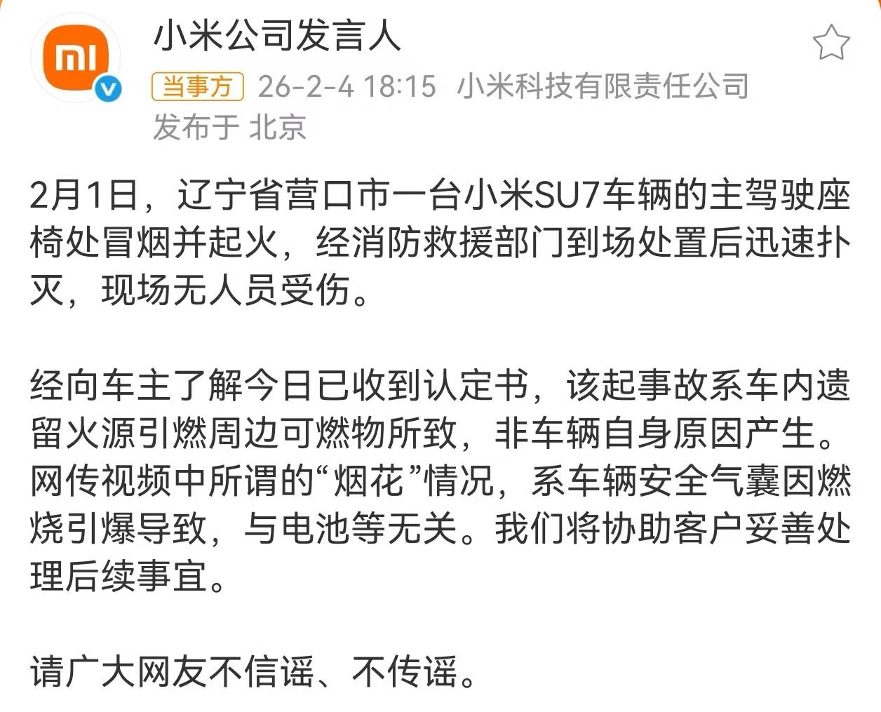 针对网传“车辆自燃”的质疑,小米公司发言人进一步澄清,经与车主确认,事故原因已由相关部门出具认定书,明确起火系车内遗留火源引燃周边可燃物所致,与车辆本身质量无关。针对部分视频中出现的“疑似烟花爆炸”画面,公司解释称,该现象实为车辆安全气囊因高温燃烧触发引爆,与电池系统无任何关联。