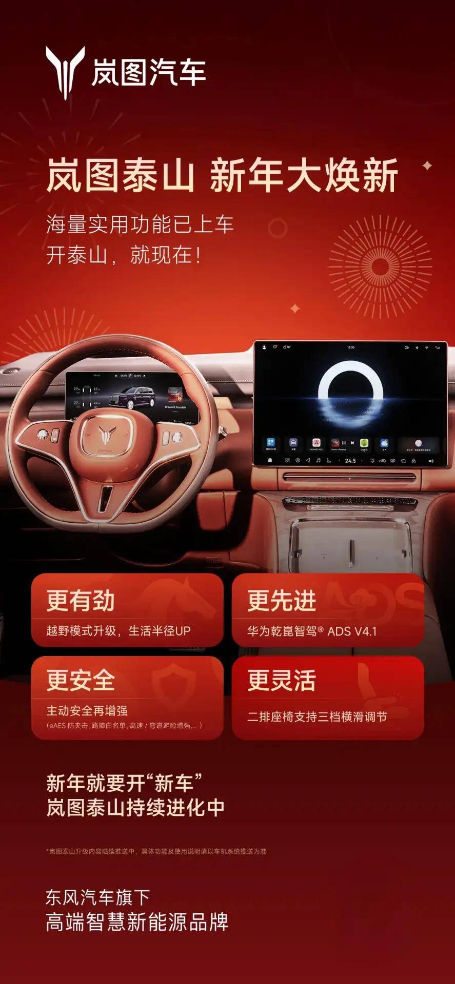 岚图汽车宣布,旗下旗舰大六座SUV岚图泰山正式向车主推送首次重大OTA升级,以华为乾崑智驾ADS 4.1为核心,实现智能座舱、辅助驾驶与越野性能三大领域的全面进化。此次升级不仅突破了高端商务SUV“城市代步”的传统定位,更以“商务+越野”双场景优势重新定义了细分市场的价值标准,为高端用户带来全场景智能出行新体验。