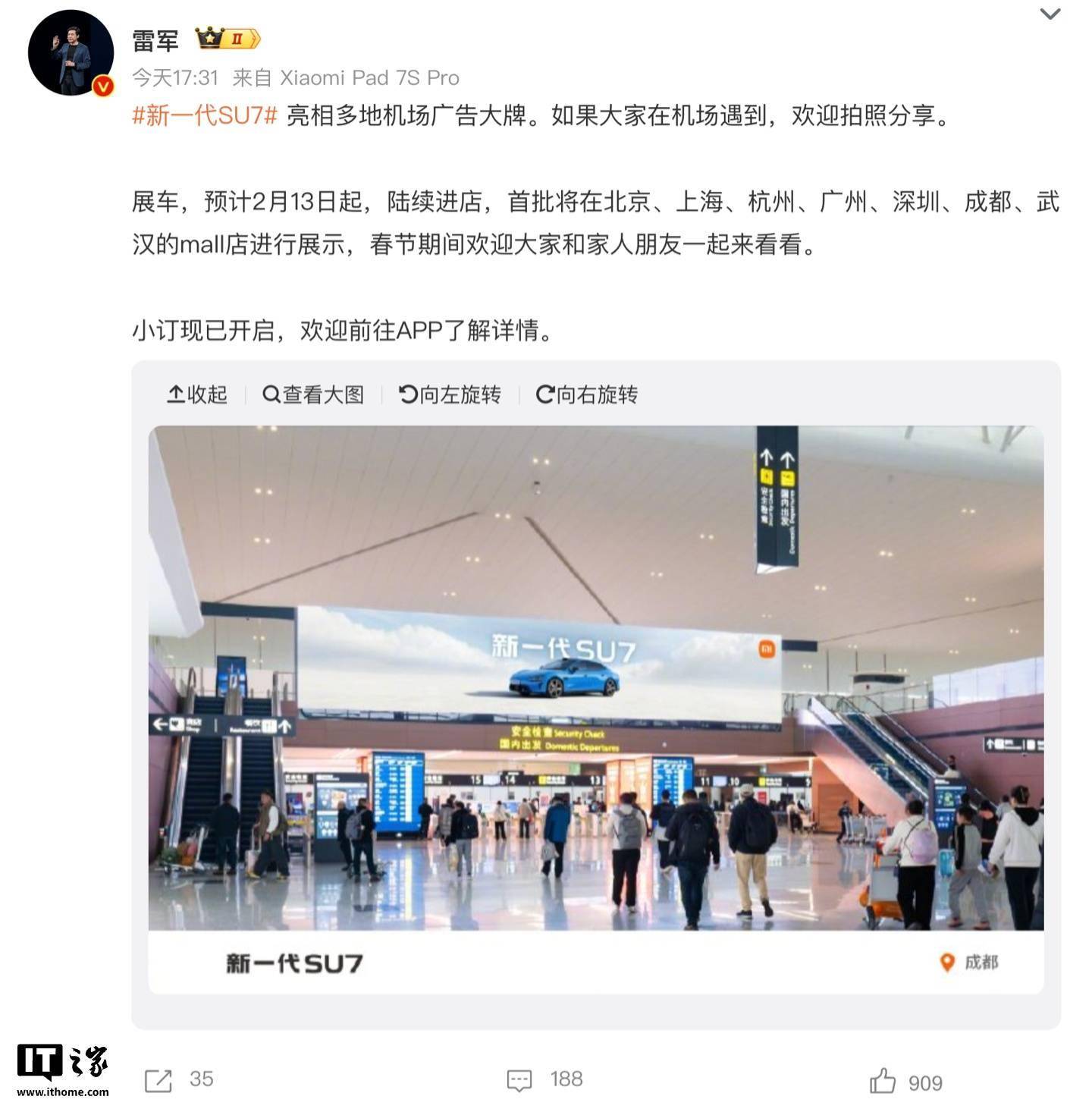 近日,小米汽车创始人雷军通过社交媒体宣布,新一代小米SU7已正式登陆多地机场的广告大屏,并邀请公众在机场偶遇时拍照分享。根据雷军微博照片的水印信息,相关广告已出现在成都机场,引发广泛关注。