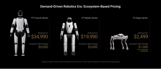 FF EAI机器人独创“终端+生态技能包”全新生态价格体系:Futurist 系列终端起售价为 $34,990,生态技能包价格为$5,000;FF Master 系列起售价为 $19,990,生态技能包价格$3,000;FX Aegis系列 起售价为 $2,499,生态服务包价格$1,000。这一杀手级价格,将加速EAI机器人普及,推动其从概念走向规模化、刚需化的实际应用时代。