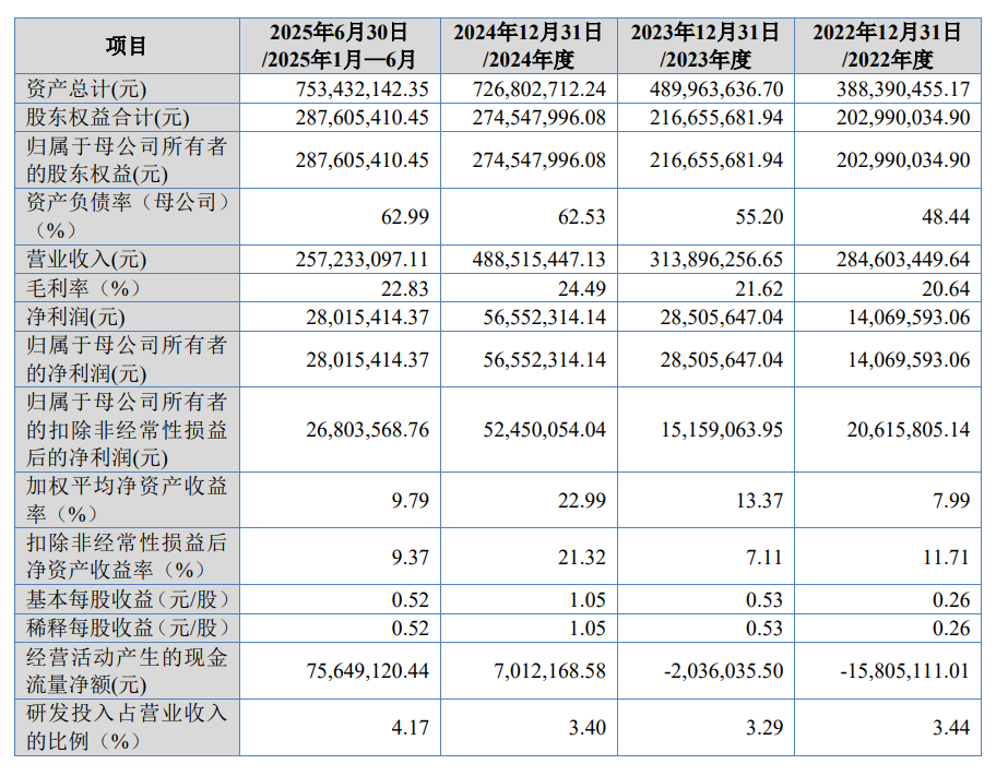 财务数据显示,玉健健康在报告期内(2022年至2025年上半年)表现出稳健的增长态势。2022年,公司实现营业收入2.85亿元,净利润1406.96万元;2023年,营业收入增长至3.14亿元,净利润提升至2850.56万元;2024年,公司进一步扩大市场份额,营业收入达到4.89亿元,净利润跃升至5655.23万元;2025年上半年,公司实现营业收入2.57亿元,净利润为2801.54万元。这一系列数据充分体现了玉健健康的经营韧性和市场潜力。