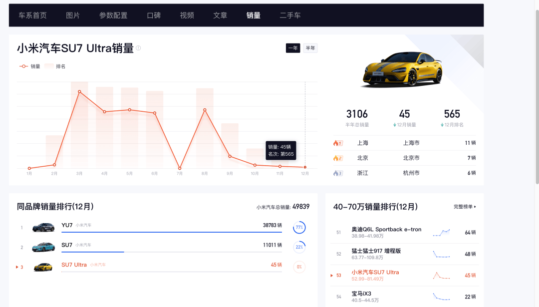 市场数据揭示了调整背后的深层原因。懂车帝平台显示,SU7 Ultra在2025年3月创下3101辆的月销峰值后,销量呈现断崖式下跌:9月488辆、10月130辆、11月跌破百辆,12月仅售出45辆。虽然全年累计销量突破1万辆完成既定目标,但其中超过70%的销量集中在上半年完成。