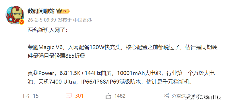 折叠屏赛道再添新军,荣耀Magic V6通过工信部入网认证。据供应链消息,这款横向大折叠手机将搭载骁龙8 Elite Gen5处理器,配备7000mAh超大容量电池,机身厚度较前代进一步缩减。行业分析师指出,荣耀在铰链技术、屏幕耐用性等核心领域已建立技术壁垒,新品有望在MWC2026期间成为关注焦点。REDMI Turbo 5系列首销数据同步披露,虽未公布具体销量,但官方确认同比实现显著增长,详细市场表现待后续数据补充。