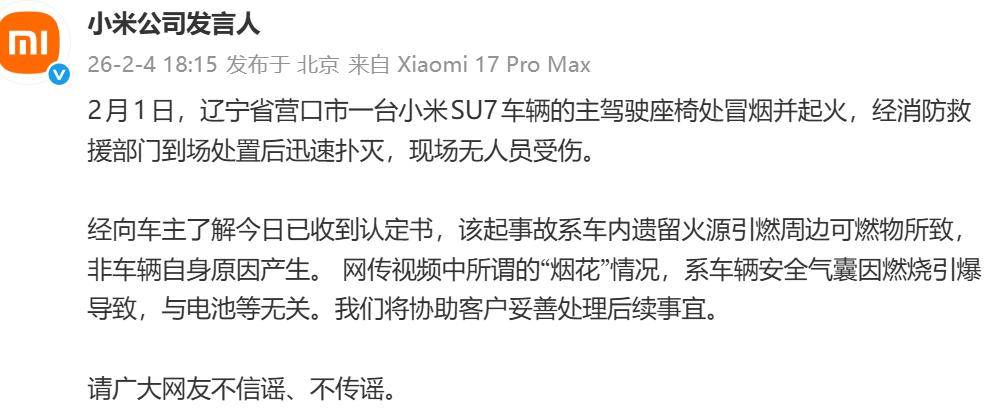 近日,新能源汽车安全问题再次引发社会关注。2月4日晚,小米公司发言人通过官方渠道就辽宁省营口市发生的小米SU7车辆起火事件发布情况说明。据通报,2月1日西头工业园内一辆小米SU7在充电后主驾驶座椅处突发冒烟,随后明火从车内窜出并伴随爆燃声,最终车辆被烧至仅剩金属骨架。经消防部门调查认定,事故系车内遗留火源引燃周边可燃物所致,与车辆自身系统无关,网传视频中出现的“烟花”实为安全气囊因燃烧引爆产生。