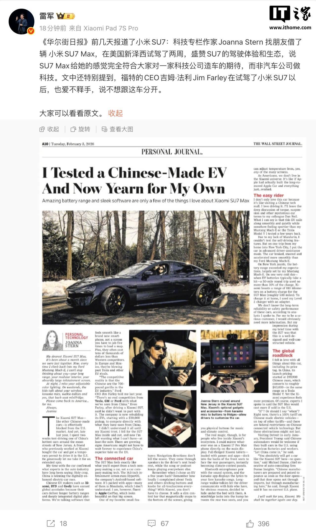 小米SU7近期在国际汽车圈引发广泛关注。据《华尔街日报》报道,科技专栏作家乔安娜·斯特恩通过朋友借到一辆小米SU7 Max,在美国新泽西进行了为期两周的深度试驾。她在体验后盛赞这款车型的驾驶感受与智能生态系统,认为其完美契合科技公司跨界造车的创新定位,与传统汽车厂商的科技应用形成鲜明对比。