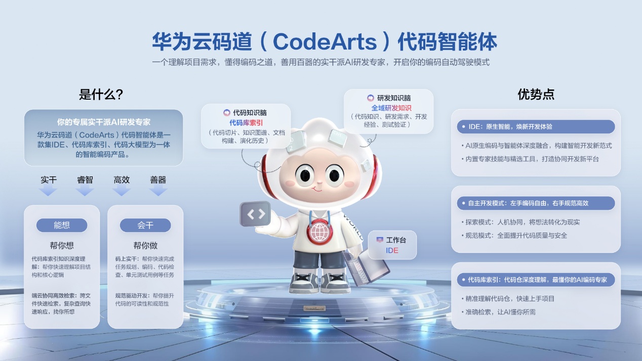 华为云码道(CodeArts)代码智能体已在项目级代码生成、Agent知识增强、代码续写、研发知识问答、单元测试生成等场景实现开发者效率提升,同时也支持丰富工具生态,助力高效开发与个性化定制。