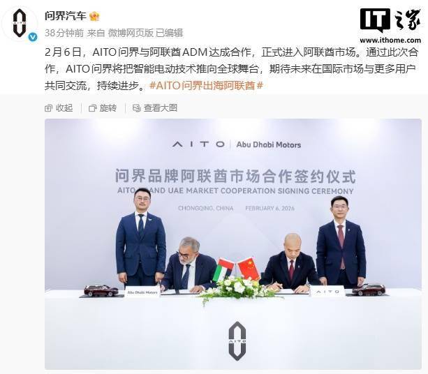AITO问界品牌近日迈出全球化重要一步,正式宣布与阿联酋知名企业ADM达成战略合作协议,标志着这一中国高端新能源汽车品牌正式进军中东市场。此次合作将依托ADM在当地成熟的销售网络和服务体系,为阿联酋消费者带来智能电动汽车新体验。