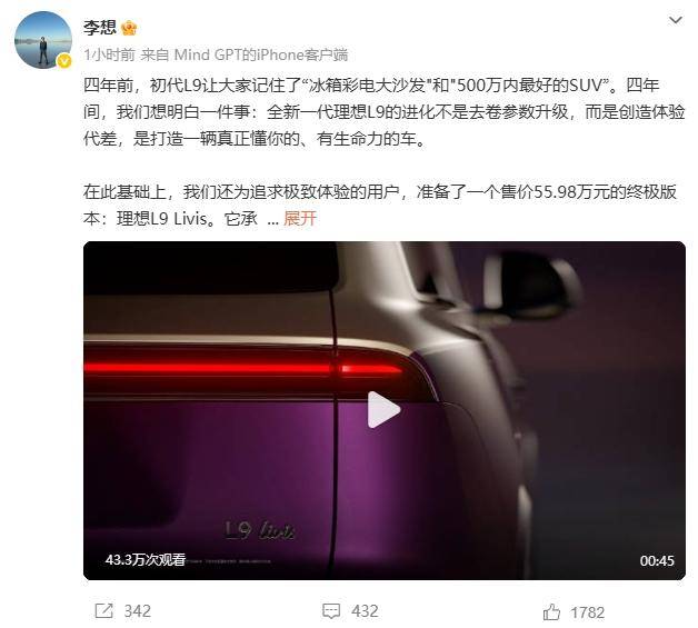 据理想汽车CEO李想透露,全新L9的研发重心从参数堆砌转向体验代差。他特别提到,四年前初代车型以“500万内最好SUV”的标签打开市场,而新一代产品将通过智能化与机械性能的深度融合,打造“有生命力的座驾”。为满足高端用户需求,理想同步推出售价55.98万元的L9 Livis终极版本,该车型承载了品牌对未来出行的核心思考。