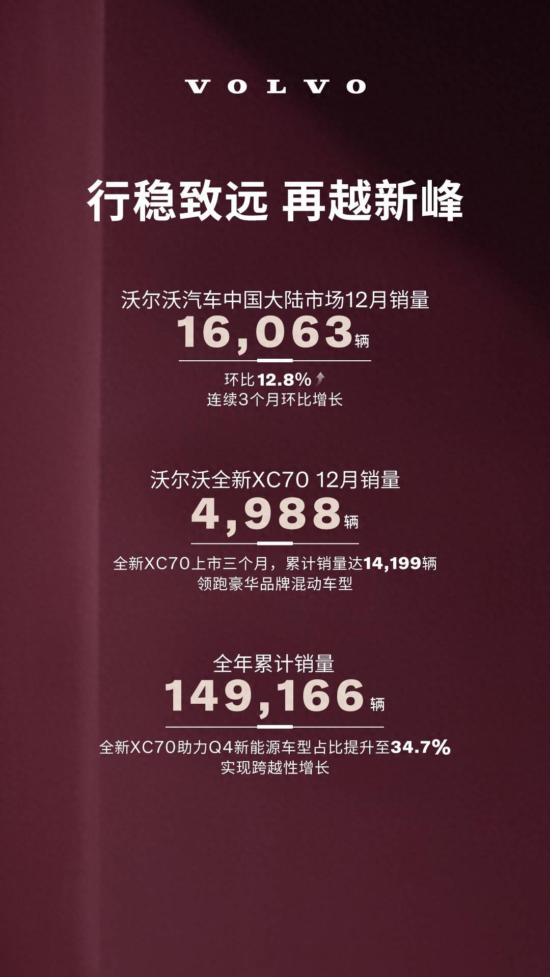 沃尔沃汽车在中国大陆市场交出了一份亮眼的成绩单。数据显示,2025年12月单月销量达16,063辆,较去年同期增长12.8%,全年累计销量突破149,166辆。这一成绩不仅体现了品牌在豪华车市场的稳健表现,也反映出消费者对沃尔沃产品力的持续认可。