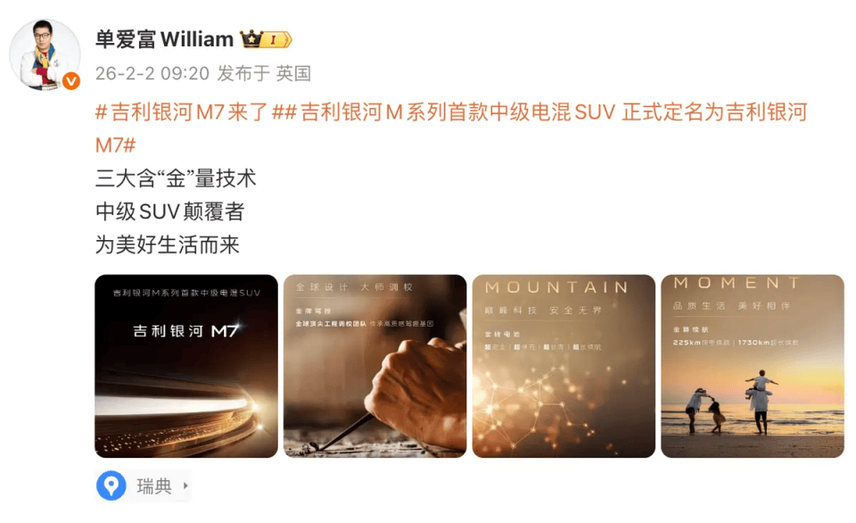 近日,吉利汽车旗下全新车型银河M7的官方图片正式发布,引发市场广泛关注。这款定位为5座中型SUV的新车,凭借其插电式混合动力系统和超长续航表现,成为消费者热议的焦点。