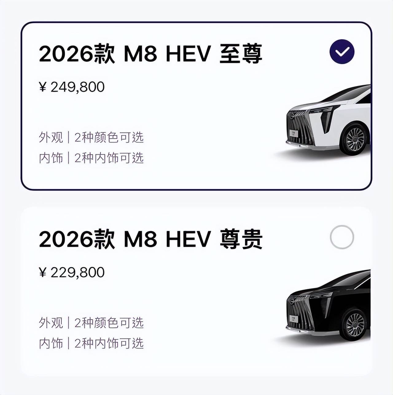 与在售车型相比,2024款M8大师系列超级混动版的起售价为26.68万元,而2026款M8 HEV以22.98万元的起售价将混动版门槛降低了近4万元,实现了与2024款M8燃油尊贵版的“油电同价”。对于在燃油与混动车型之间犹豫的消费者而言,2026款M8 HEV在油耗和静谧性方面的优势显著,且配置水平未因价格调整而缩水,性价比进一步提升。