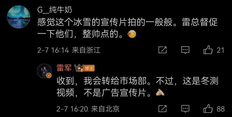 视频发布后,部分网友对拍摄质量提出改进建议。有用户留言指出:"画面清晰度有待提升,建议加强后期制作的专业性。"针对这些反馈,雷军迅速作出回应,表示已将相关意见转达市场部门,同时特别说明该视频为真实测试记录,并非商业广告宣传片。