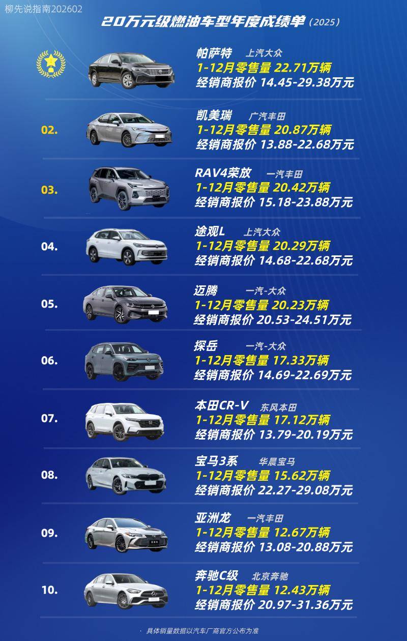 在燃油车市场的细分领域中,20万元级市场极具代表性,是各大车企竞争的核心焦点。即便整体燃油车市场呈下滑态势,20万元级燃油车市场依然拥有稳定的基本盘。这一价格区间的车型,既能满足消费者对品质、空间和配置的需求,又不会像高端豪华车型那样价格过高,精准覆盖了中端家用、商务通勤等主流用车场景,无论是家庭用户还是商务用户,都能从中找到心仪的车型。