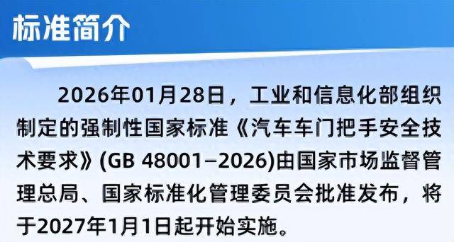 与此同时,公安部组织起草的《机动车运行安全技术条件》征求意见稿也于去年11月公开征求意见。该文件新增多项安全要求,包括新能源汽车动力电池防护、门把手功能等。其中明确规定,乘用车需为每个乘员提供至少两个不同的上下车车门,所有车门(不含尾门)必须配备机械释放功能的内、外把手。若装备电动内把手,需同时配备机械应急把手,并在解锁装置附近设置醒目标志。