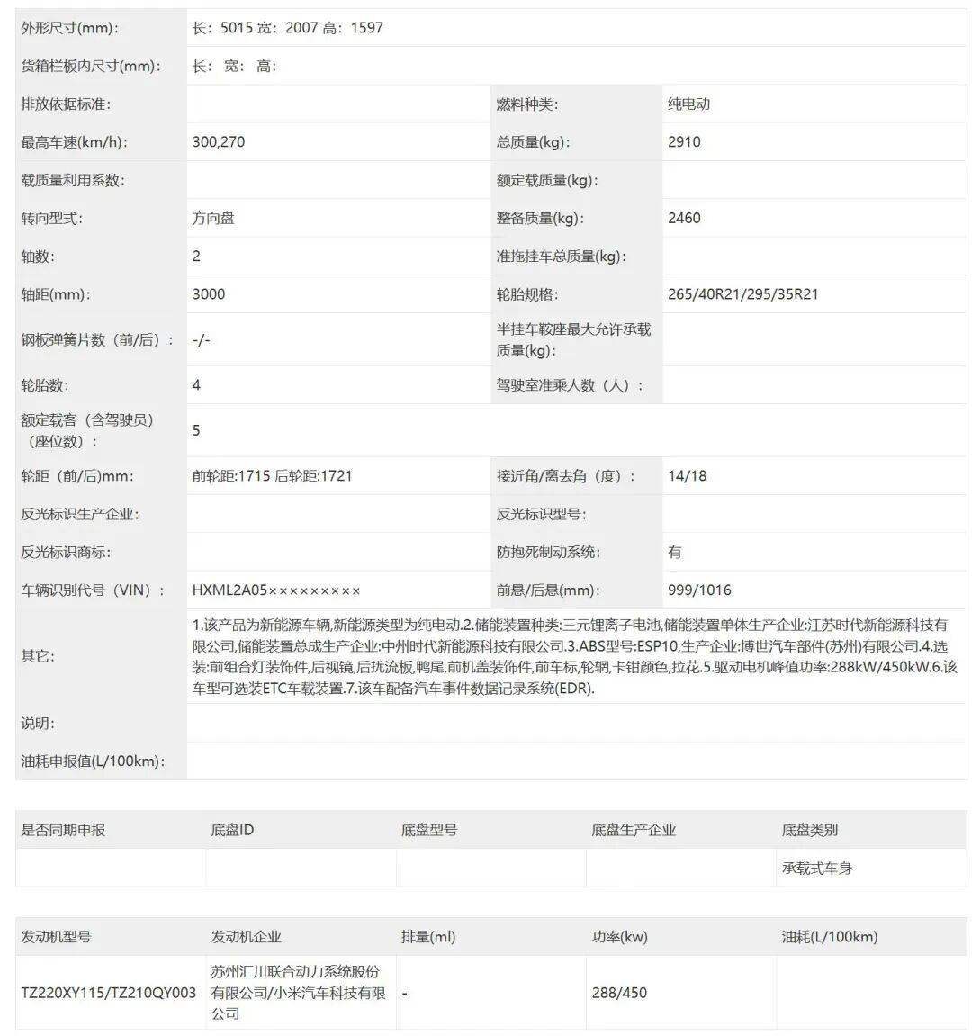 动力系统延续双电机四驱布局,前电机由汇川提供,最大功率288kW;后电机采用小米自研技术,最大功率提升至450kW。虽然电池容量与续航数据尚未公布,但300km/h的极速表现已彰显其性能定位。值得关注的是,新车在申报信息中展示了多种造型的轮毂与卡钳颜色选项,为消费者提供更丰富的个性化选择空间。