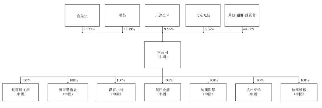 铜师傅成立于2013年,以铜为核心材质,通过垂直整合研究、设计、生产与销售环节,打造兼具文化内涵与艺术价值的工艺品。近年来,公司逐步将材质范围扩展至金、银及塑胶领域,以吸引更广泛消费群体。创始人俞光目前持有公司26.27%的表决权,担任董事长兼CEO职务。其管理团队包括执行董事罗仁祥、何贇、汪小霞及陈锐广,非执行董事肖峰,以及独立董事涂必胜、黄文礼和方俊辉。