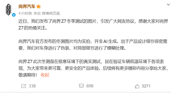 面对迅速发酵的舆论,尚界汽车于2月9日紧急发布声明。官方强调三方面内容:其一,所有冬测图片均为极寒环境下的实拍素材,不存在AI生成或修图伪造;其二,轮毂与轮胎的视觉差异源于测试阶段的保密处理,对局部细节进行模糊处理导致视觉偏差;其三,冬季测试旨在验证电池续航、动力输出等核心性能,为量产上市做准备,没有伪造测试的必要。