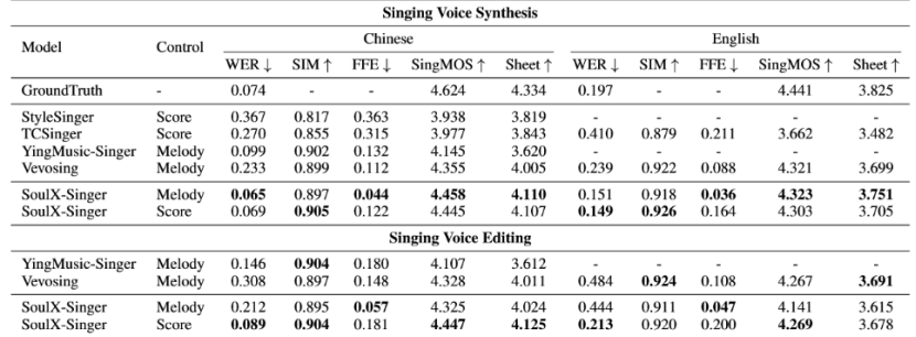 实验结果表明,SoulX-Singer 在语义清晰度、歌手相似度、基频一致性以及整体合成质量等多个维度上均显著优于此前的相关工作;在主观听感评测中,其表现同样取得了明显领先优势。