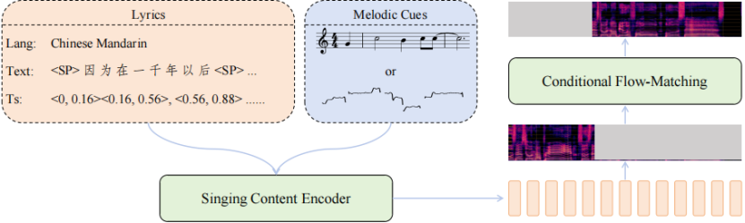 在模型架构上,SoulX-Singer 采用基于Flow Matching 的生成建模范式,并将歌声合成问题建模为一种 audio infilling(音频补全)任务。针对歌声合成中“歌词—旋律—发声”三者强耦合的特点,SoulX-Singer 在建模阶段显式引入了 note 级别的对齐机制。