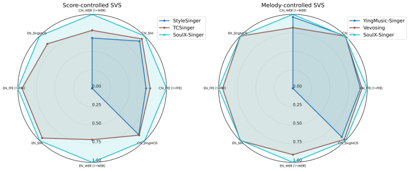 SoulX-Singer 当前支持普通话、英语和粤语三种语言的歌声合成,并在不同语言和音乐风格下均展现出稳定一致的合成质量。这一多语言能力为其在内容创作、虚拟歌手、互动娱乐等应用场景中的落地提供了更广阔的空间。