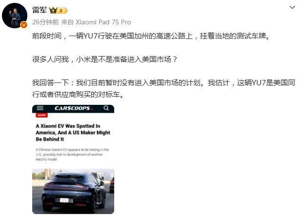 针对这一猜测,小米创始人雷军在微博上进行了回应。他明确表示,小米目前暂时没有进入美国市场的计划。雷军推测,这辆出现在美国的YU7很可能是美国同行或者供应商购买的用于对标研究的车。