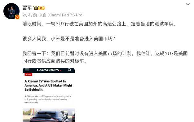 针对这一疑问,小米创办人、董事长兼CEO雷军在社交平台上做出了回应。他明确表示,小米汽车目前暂时没有进入美国市场的计划。雷军解释称,前段时间出现在美国加州高速公路上的那辆YU7,很可能是美国同行或供应商购买的对标车。
