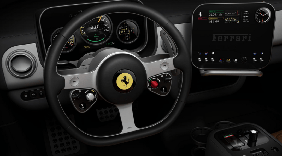 内饰设计由苹果前首席设计官Jony Ive创立的LoveFrom团队主导,在保留法拉利机械操控基因的同时,融入极简主义美学。设计师摒弃全触控化趋势,采用大量实体按键、旋钮与拨杆,方向盘控制模块布局借鉴F1赛车设计,兼顾功能性与仪式感。三辐式方向盘以19个CNC加工零件构成,使用100%再生铝材,较传统方向盘减重400克,其造型灵感源自20世纪50年代经典纳尔迪木质方向盘。