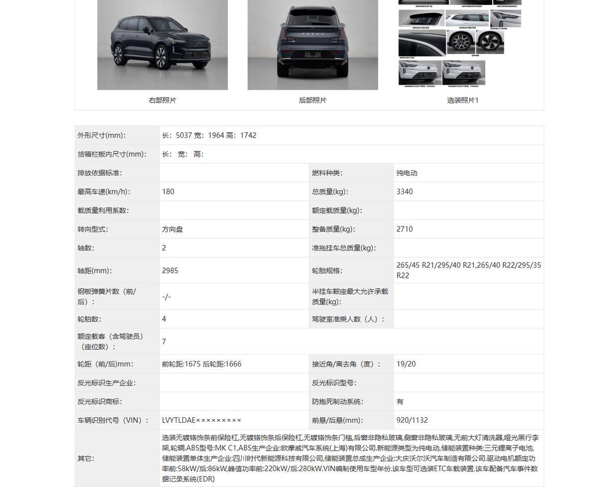 沃尔沃正加速推进新能源战略布局,其两款纯电旗舰车型EX90与ES90近日现身工信部第404批《道路机动车辆生产企业及产品公告》,标志着这两款全球车型即将正式登陆中国市场。作为品牌电动化转型的关键产品,新车在延续海外版设计语言的同时,针对中国消费者需求进行了多项适应性调整。
