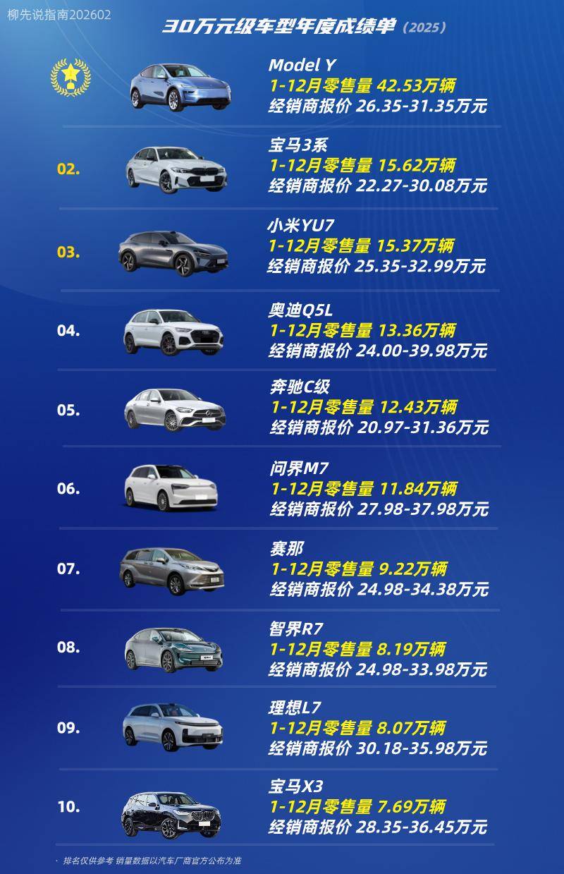 在年度销量排名中,特斯拉Model Y以42.53万台的年销量遥遥领先,成为30万元级市场的销量冠军。该车不仅空间实用,驾驶乐趣也十足,满足了家庭用户和个人用户的双重需求。特斯拉在全球范围内的强大品牌号召力,也是其销量领先的重要因素之一。紧随其后的是宝马3系、小米YU7、奥迪Q5L和奔驰C级,这些车型也各自凭借其独特的优势,在市场中占据了一席之地。