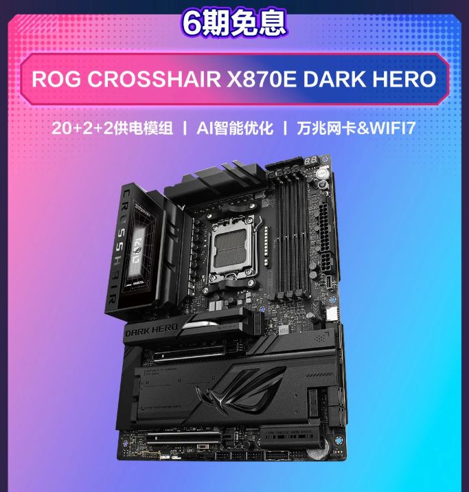 ROG CROSSHAIR X870E DARK HERO主板专为硬核玩家打造,采用经典黑配色,诠释低调而富有质感的奢华风格。搭载Polymo动态灯效2.0并支持神光同步,让玩家轻松打造个性化灯效。该主板单品售价4899元,京东商城可享6期免息,抢购链接:https://item.jd.com/100318614000.html ;华硕商城抢购链接:https://www.asus.com.cn/store/goods/detail?productId=42269745026303
