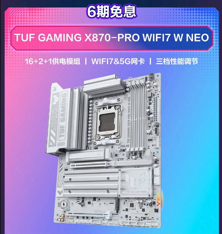 注重性价比的A饭可选择新发布的TUF GAMING X870-PRO WIFI7 W NEO主板。浅色PCB加上大面积皓月白散热装甲,打造出极具金属质感和科技感的外观。精选TUF军规用料,秉承坚固耐用、持久稳定的精神,将华硕日益精进的电竞黑科技融入其中,助力玩家一路过关斩将、所向披靡。该主板单品售价2549元,京东商城可享6期免息,购买链接:https://item.jd.com/100238768727.html ;华硕商城购买链接:https://www.asus.com.cn/store/goods/detail?productId=42269746004793